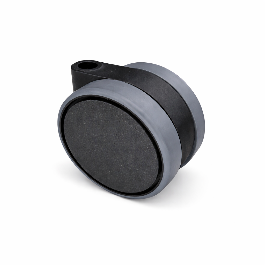 Hochwertige Doppelrolle mit einem Raddurchmesser von 75 mm überzeugt durch ihre weiche, graue Lauffläche und eine durchgehende Radachse, die für besondere Stabilität sorgt. Das schwarze Gehäuse verleiht der Rolle ein modernes, unauffälliges Design, ideal für stilvolle Anwendungen im Innenbereich.