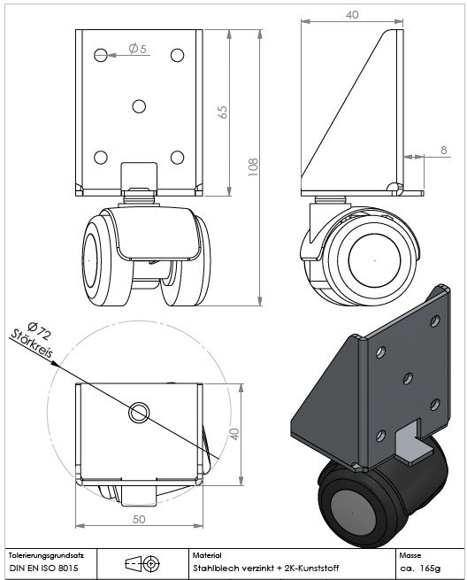 Befestigungsplatte ist mit einer Doppelrolle ausgestattet, die eine Ø35 mm weiche Lauffläche besitzt – ideal für eine schonende und leise Bewegung. Sie ist ohne Feststeller gefertigt und eignet sich hervorragend für die seitliche Montage. Die integrierte Anschlagnase sorgt für eine sichere Abstützung und stabile Befestigung.