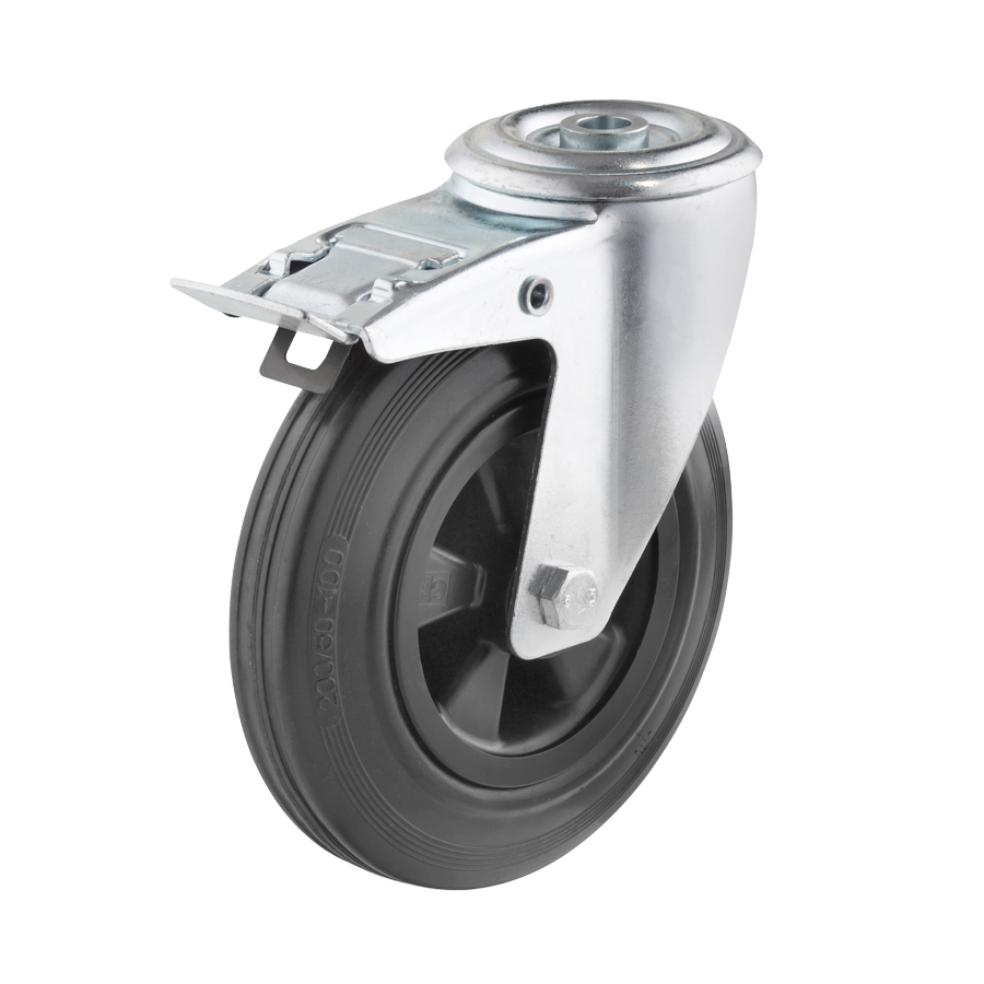 Lenkrolle mit Feststeller und Rückenloch, leichtes Gehäuse verzinkt, Radkörper aus Kunststoff, Lauffläche aus Vollgummi, Rollenlager aus Stahl